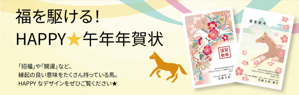 「招福」や「開運」など、縁起の良い意味をたくさん持っている馬。そんな幸運を呼ぶ馬をモチーフにした、ハッピーな年賀状デザインが揃っているそうです。